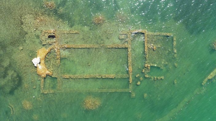 Bursa'nın İznik ilçesindeki göl kıyısının 20 metre açığında bulunan, 1500 yıl önce Aziz Neophytos’un adına inşa edildiği belirlenen batık bazilika, İznik Gölü’nde suyun çekilmesiyle ortaya çıktı.