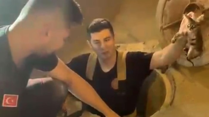 Kanalizasyon borusundan kedi sesi duyan vatandaşlar, durumu hemen itfaiye ekiplerine bildirdi.