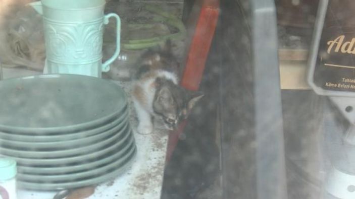 Dışarı çıkamayan anne ve yavru kedi içeride mahsur kaldı. Bu sırada dükkanın önünden geçen Leyla Asan, içeride kedilerin mahsur kaldığını fark etti.