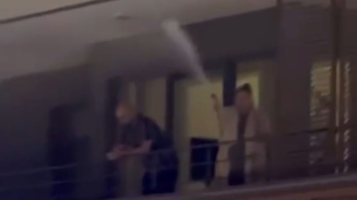 Duruma sinirlenen ev sahipleri, araçların üzerine balkondan su sıktı.