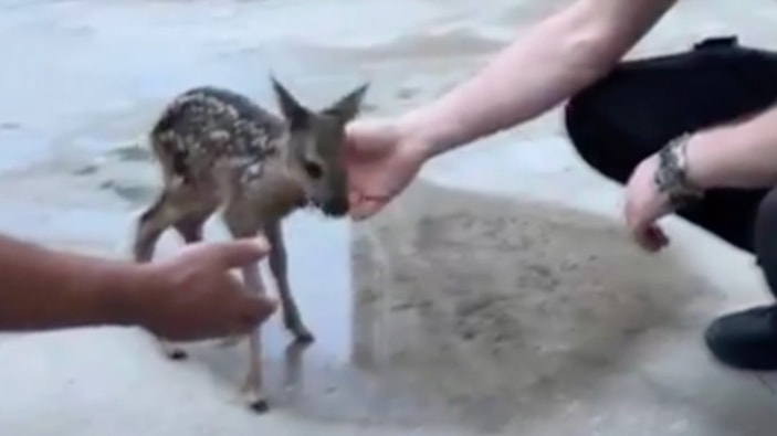 Yürümekte zorlanan yavru karacanın aç olduğunu düşünen polisler, süt alarak besledi.