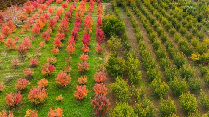 Santa Maria cinsi armut, şeftali ve elma bahçelerindeki renk cümbüşü, drone'la havadan görüntülendi.