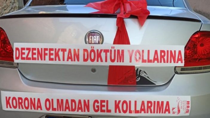 Düğün arabalarını süsleyen damat Osman Demirkol, aracın üzerine, “Dezenfektan döktüm yollarına korona olmadan gel kollarıma” yazısı yazarak gelin almaya gitti.
