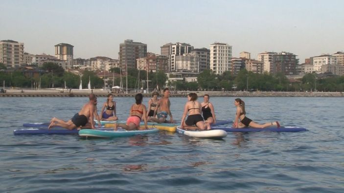 İstanbul’un Kadıköy ilçesi Caddebostan Sahili’nde bir araya gelenler, eğitmenler eşliğinde kıyıdan metrelerce açıldı, denizde board üzerinde yoga keyfi yaşadı.