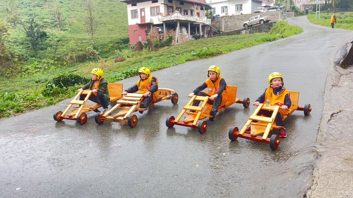 Rize'nin Çamlıhemşin ilçesinde 'Laz Ralli' adıyla düzenlenen tahta araba yarışlarının 15.'si yapılırken katılımcılar, sağanak altında saatte 50 kilometre hıza ulaşan yarışlarda büyük bir mücadele verdi.