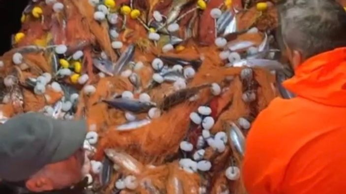 Çanakkale Boğazı’nda ağlarına tek seferde yaklaşık 2 bin palamut takıldı VİDEO