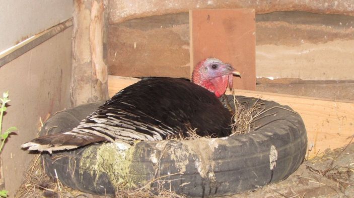 Erkek hindinin 15 gündür dişisinin yumurtalarının üzerinde kuluçkaya yatması sahibini şaşkına çevirdi.