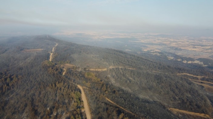 Gelibolu ilçesinde önceki gün çıkan orman yangını büyük ölçüde kontrol altına alınırken, yanan alanlar dron ile havadan görüntülendi. Yemyeşil ormandan geriye siyah alanlar kaldı.