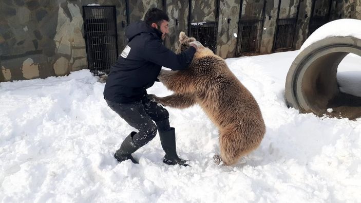 Karın yağması ile birlikte karla kaplanan hayvanat bahçesindeki ayı, bakıcısı ile birlikte kar üstünde güreşti.