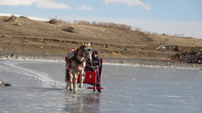Ardahan ve Kars arasında bulunan Çıldır Gölü, soğuk havanın etkisiyle donmaya başladı. Kar yağışının olmadığı bölgede, atlı kızaklar göl üstünde ziyaretçilere unutulmaz anlar yaşatıyor.