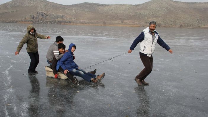 Sinan Genç, "Göl görmüş olduğunuz gibi buz tuttu. Biz de çokluğumuzu özledik ve onlarla birlikte buz üstünde kızakla kayarak buzun tadını çıkarıyoruz." dedi.