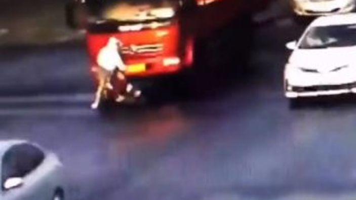 Çin'de bir kamyonet, hatalı geçiş yapan motosikletli bir kadına çarptı. Çarpmanın etkisiyle kamyonetin altına giren kadın, mucizevi bir şekilde kazayı yara almadan atlattı.