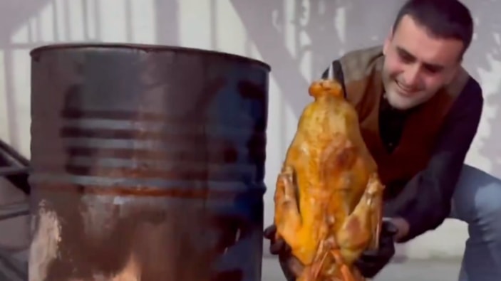 Halk arasında 'tenekede tavuk' olarak bilinen yemeği kendine özgü şekilde yorumlayan Czn, yeni yıla özel varil içinde 2 adet hindi pişirdi.
