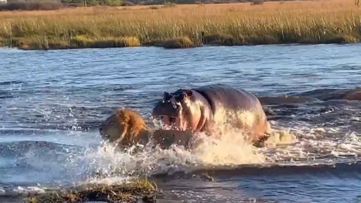 Ancak o hayvanlardan biri, su aygırı tarafından kısa süreli saldırıyla karşı karşıya kaldı. Korkuya kapılan aslan, güçlükle sudan çıkarak bölgeden uzaklaştı.