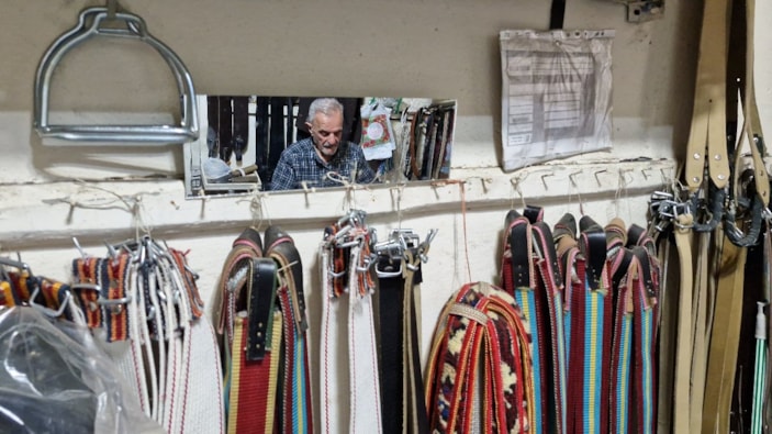 92 yaşındaki Kemal Gürcüm, 12 yaşında başladığı saraçlık mesleği hakkında, "Eskiden iş vardı, şimdi yok. Yaptığım eyerler artık o kadar satılmıyor. Bu meslek öldü, vakit geçsin diye dükkana geliyorum” dedi.