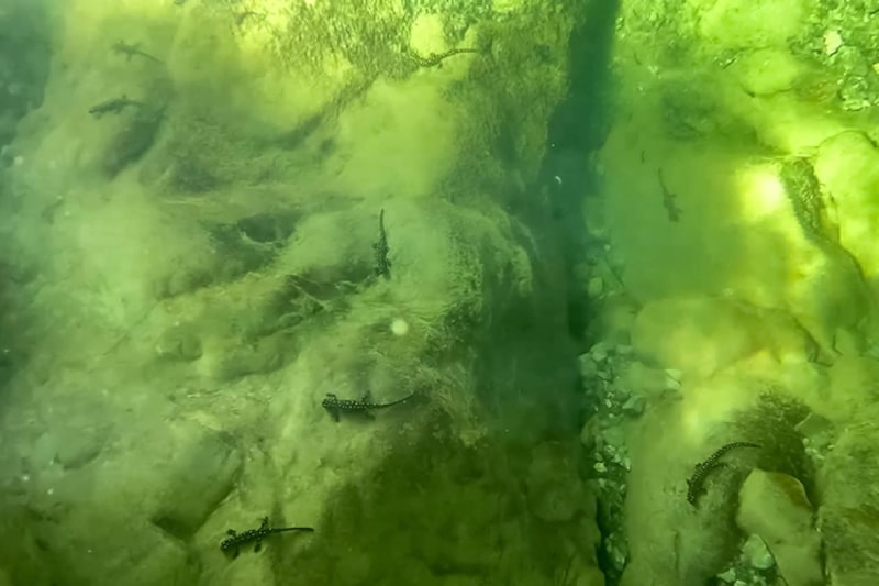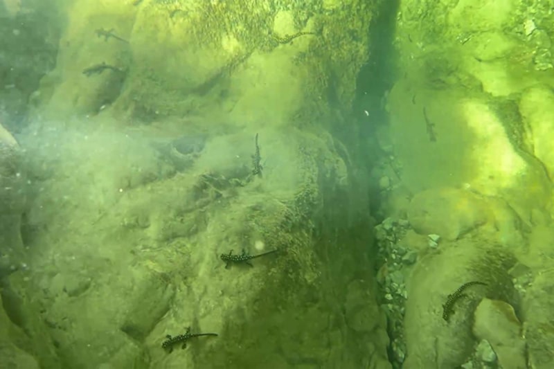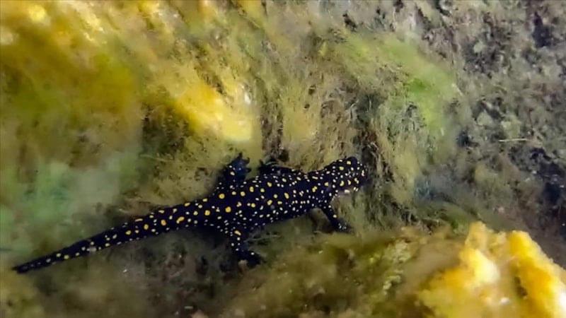 Hani ilçesinde nesli tükenme tehlikesi altındaki "Türk semenderi" olarak bilinen sarı benekli semenderlerin yüzlercesi su altında görüntülendi.