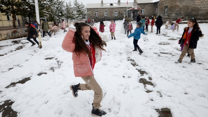 Kar yağışına sevinen çocuklar okul bahçesinde kar topu oynadı, kardan adam yaptı. Göçmen kuşlar da ağaç ve bitki tomurcuklarıyla beslenmeye çalıştı.