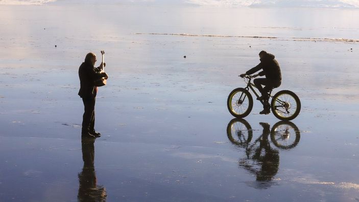 Aşıklık geleneğini yaşatan Yener Yılmazoğlu, bağlamasıyla buzla kaplı Çıldır Gölü üzerinde gezintiye çıktı.