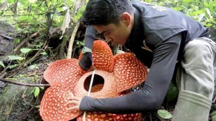 Endonezyalı doğa korumacıları, dünyanın en büyük çiçeklerinden biri olan Raflesya'nın şimdiye kadar rastlanan en büyük boyutlara ulaşanı bulundu.