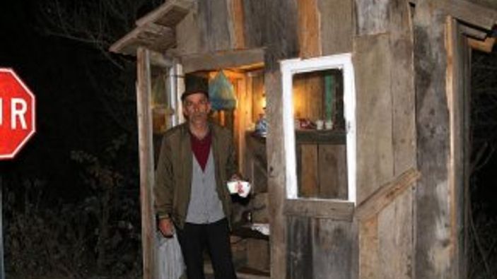 Durakta yaptığı kulübenin içini her sabah ısıtıyor