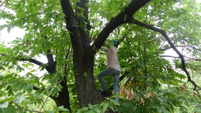Aydın'ın Efeler ilçesinde kestane, çam fıstığı, ceviz ve benzeri ürünleri 20 metre yükseklikteki ağaçlara çıkarak silkeleyip, döken 38 yaşındaki Şaban Işıldak 16 yıldır bu işten geçimini sağladığını söyledi.