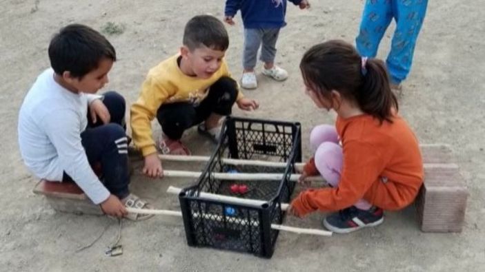 Elazığ'da üniversiteli genç Ensar Gürsul, köyündeki çocukların sosyal aktivitelerde bulunması için plastik meyve kasası üzerine tahta çubuklar ve plastik kapaklar yerleştirerek langırt yaptı.