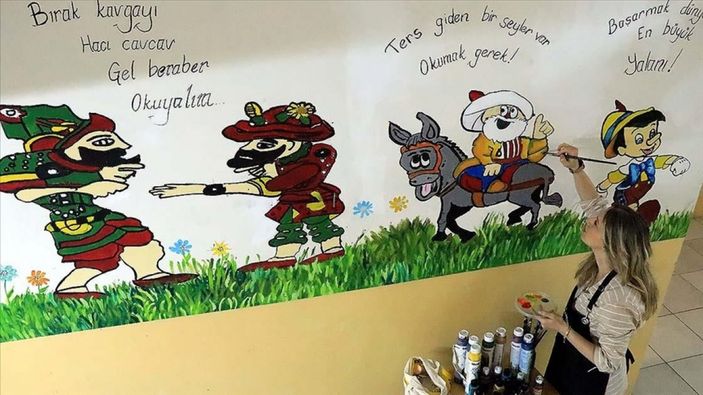 Elazığ'da 23 yıllık görsel sanatlar öğretmenliği yapan Yeliz Tuğal, gönüllü olarak gittiği okulların duvar, sınıf, merdiven ve depolarına eğitici resimler yapıyor.