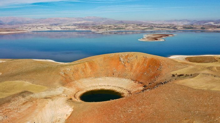 Keban Baraj Gölü'nde suların çekilmesiyle ortaya çıkan dev obruk