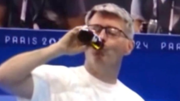 Yapay zeka teknolojisi ile yapılan videoda Yusuf Dikeç, gümüş madalya kazandığı atışının ardından cam şişedeki içeceğini yudumluyor.