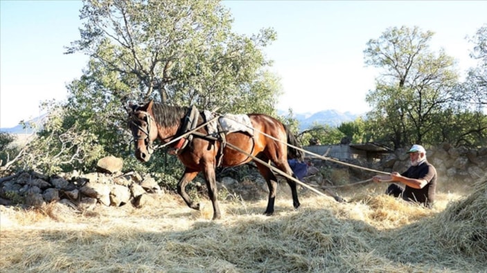 Arkadaşlar, tarladan topladıkları sapları atlarla harmana taşıyarak, alt yüzeyinde keskin çakmak taşları bulunan kızak biçimindeki düveni kullanıyor. Baktır, bu sayede geçmiş hatıraları yeniden canlandırdıklarını belirtti: