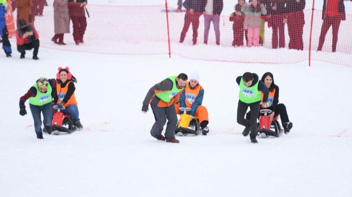 Erciyes Kayak Merkezi'nde, çiftlerin katılımıyla düzenlenen 'Artık çekilmez oldun' kızak yarışması renkli görüntülere sahne oldu.