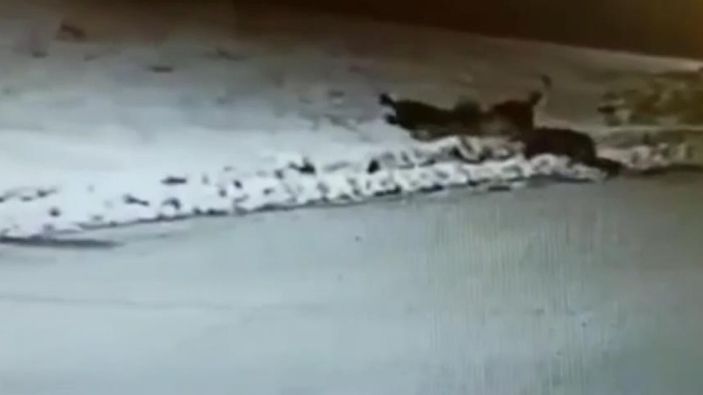 Erzincan’ın Refahiye ilçe merkezinde meydana gelen olayda, aç kaldıkları anlaşılan kurt sürüsü, sokakta gördüğü 2 köpeğe saldırdı.