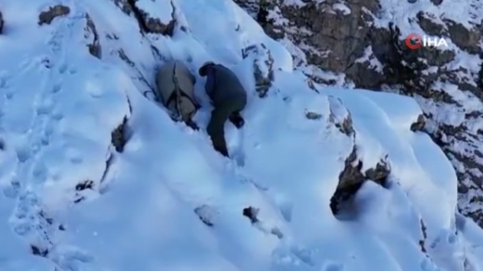 Bir süre dağ keçisinin yanında hareketsiz halde duran kişi, daha sonra karlı arazide izini kaybettirmeye çalıştı. Bu anlar havadan görüntülendi.