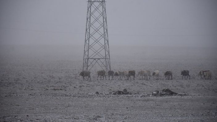 Digor ilçesinin beyaza bürünmesiyle kar yağışına hazırlıksız yakalanan besiciler, hayvanlarını meralardan köylerine getirdi.