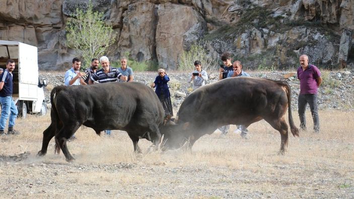 Uzun zamandır boğalarını güreştiremeyen besiciler, antrenman maçı düzenledi. Uzundere ilçe merkezinde yaşayan Serdar Çınar ile Cevizli Mahallesi'nden Hilmi Göksu, boğalarını karşı karşıya getirdi.