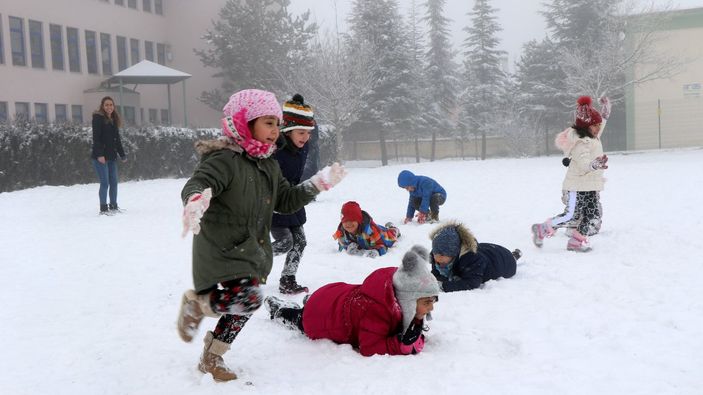 Sıkı sıkı giyinip teneffüste bahçeye çıkan öğrenciler, kendilerini bembayaz karın içerisine attı.