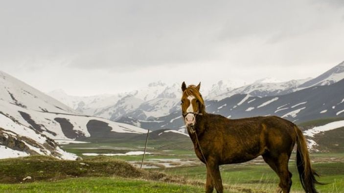 Yoğun yağışın ardından ilkbaharın yeşilin her tonunun hakim olduğu yaylada, bahar çiçeklerinin oluşturduğu renk cümbüşü ile karlı dağlar görsel bir şölen sunuyor.