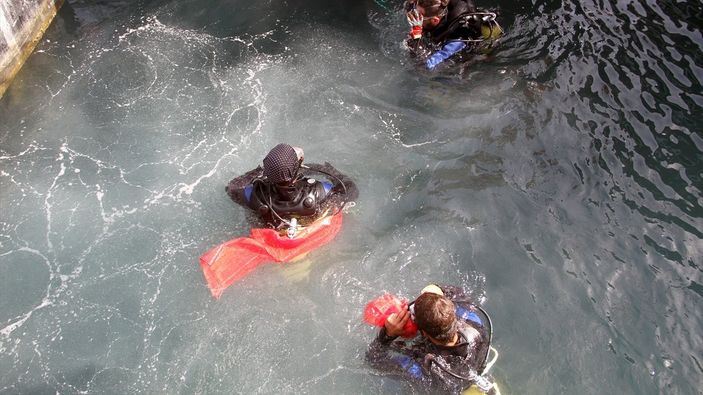 Karagözler Mahallesi'ndeki iskelede 3 dalgıç, yaklaşık bir saat süren çalışmada denizden zıpkın, plastik, cam şişe ve demir boru çıkardı.
