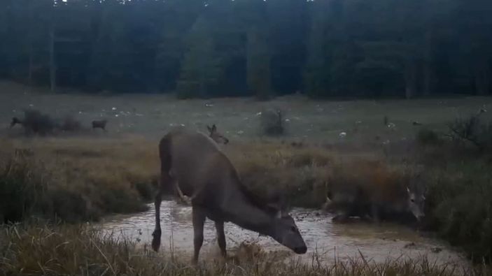 Doğa Koruma ve Milli Parklar Genel Müdürlüğü’nün fotokapanlarına yansıyan görüntülerde, kızıl geyiklerin su birikintisi etrafındaki hareketleri izleyenleri hayran bıraktı.