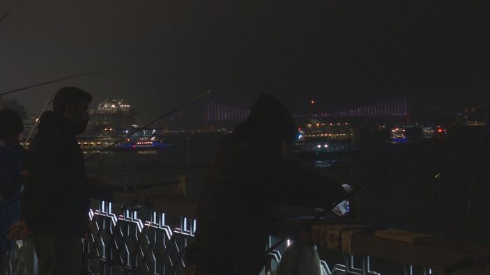 İstanbul'da akşam saatlerinde de sis etkili oldu. Sis nedeniyle görüş mesafesi düşerken, Galata Köprüsü'ndeki olta balıkçıları kafa feneri ile balık tuttu.