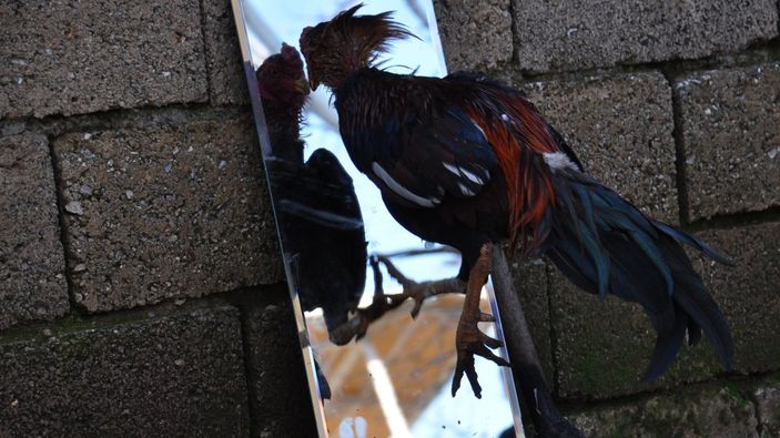Horozun aynadaki yansımasıyla kavgasını görüntüleyen İbrahim Göğebakan, "İş yerimizin arka bölümündeki alanda 15 tavuk ve horoz besliyorum. İş yerimizin lavabosunun aynası kırılınca biz de kümesin olduğu bölüme bıraktık. Dışarıya çıktığımızda horozun aynadaki görüntüsüyle kavga ettiğini görünce hem şaşırdım hem de güldüm. Biz de bu ilginç anı cep telefonu kamerası ile görüntüledik." dedi.