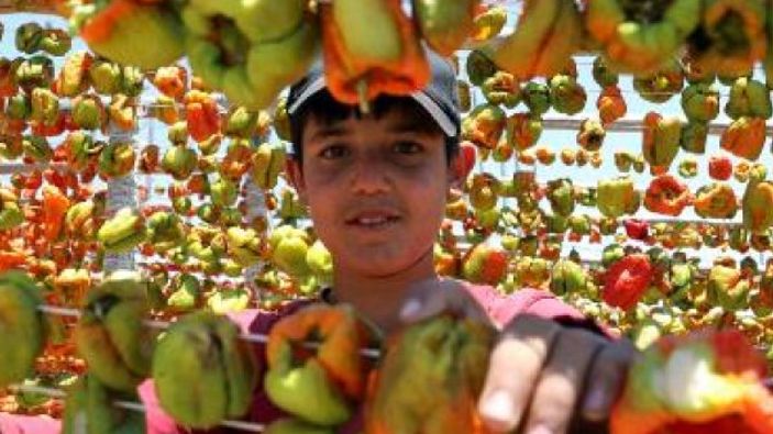 Kış aylarının vazgeçilmezi olan kuru biberler, 40 derece sıcağın altında kışa hazırlanıyor.