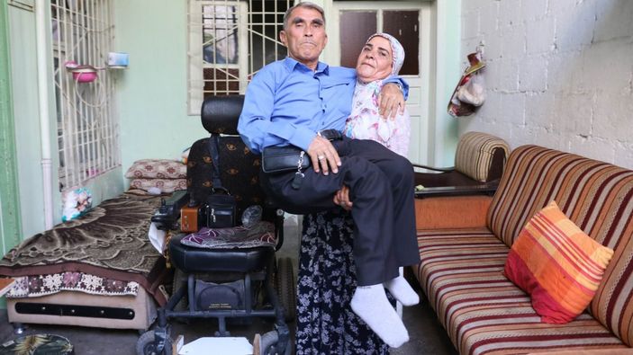 Gaziantep'te yürüyemeyen kocasını 10 yıldır sırtında taşıyor