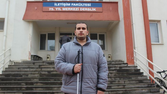 25 yaşındaki görme engelli Okan Oruç, gazeteci olma hayaliyle girdiği İletişim Fakültesi'nde hayallerine doğru emin adımlarla yürüyor.