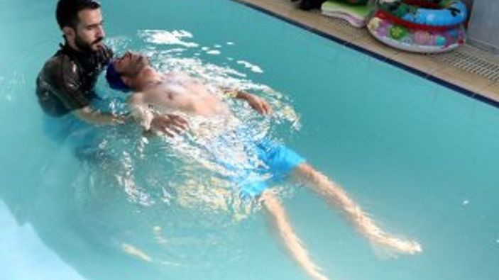 Erzurum'da 6 aylıkken geçirdiği ateşli hastalık nedeniyle yürüyemeyen Furkan Altunışık, hidroterapi havuzundaki tedaviyle yıllar sonra destek almadan adım attı.