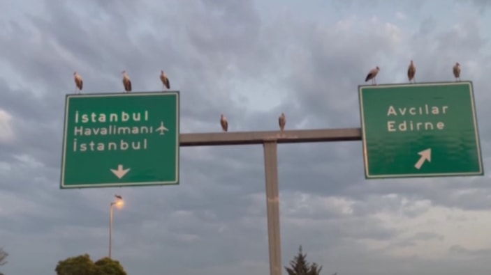 Ağustos ayında göç yolculuğuna başlayan leyleklerin, İstanbul üzerinden geçerken otoyol kenarındaki tabelalar üzerinde dinlendiği anlar görüntülendi.