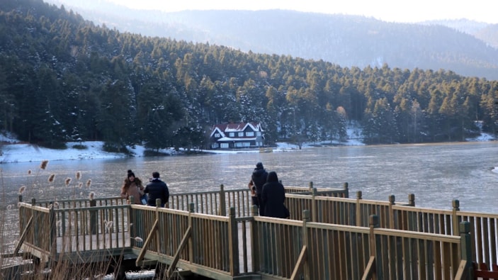 Bolu'da kentin yüksek kesimlerinde etkili olan soğuk havanın ardından Gölcük Tabiat Parkı'nda bulunan göl, buzla kaplandı.