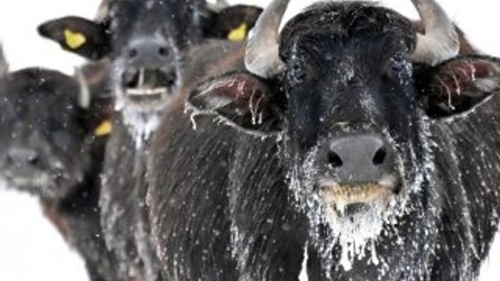Van'da Kaz Gölü'nün kısmen donmasının ardından mandaların, gölün dibindeki yosunları yeme anları güzel görüntülere sahne oldu.