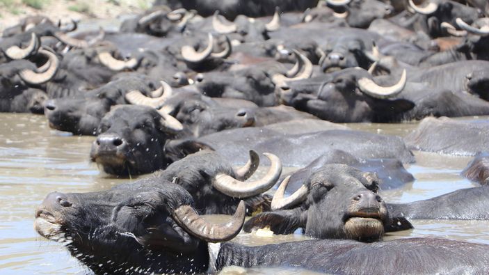 Görüntüler belgeselleri aratmıyor: Erzurum'da mandalar, doğal gölette serinliyor