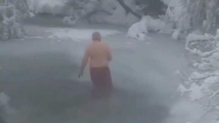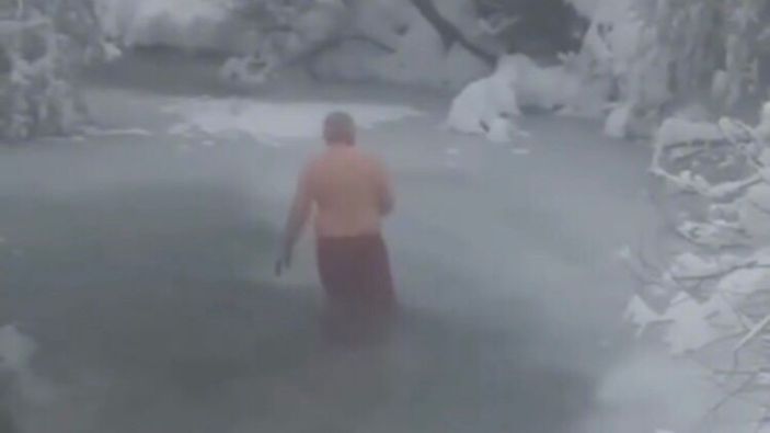 Kelkit ilçesine bağlı Ağıl Köyü'nde yaşayan Nihat Kurt, buz tutan Kelkit Çayı'nın dondurucu sularına girdi.